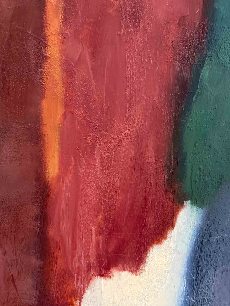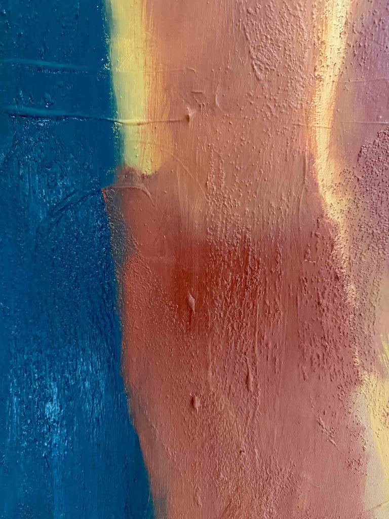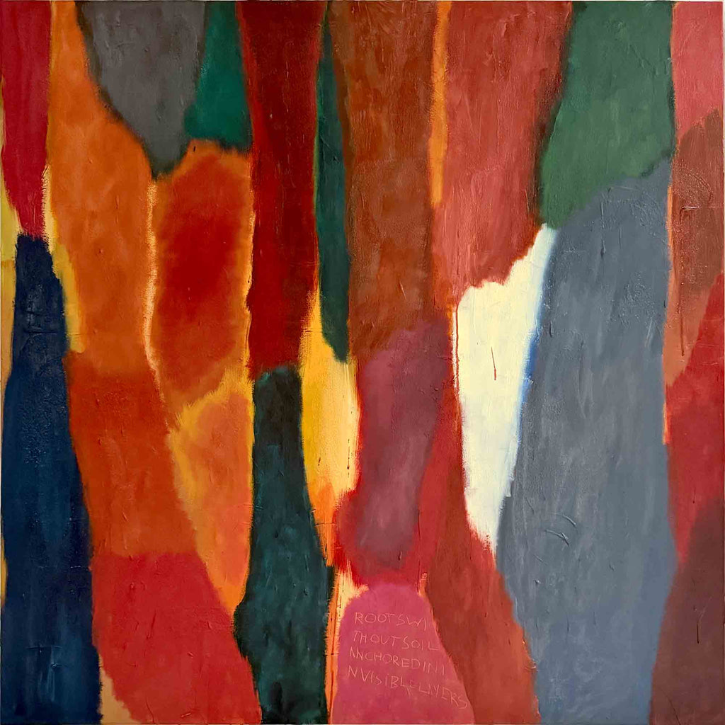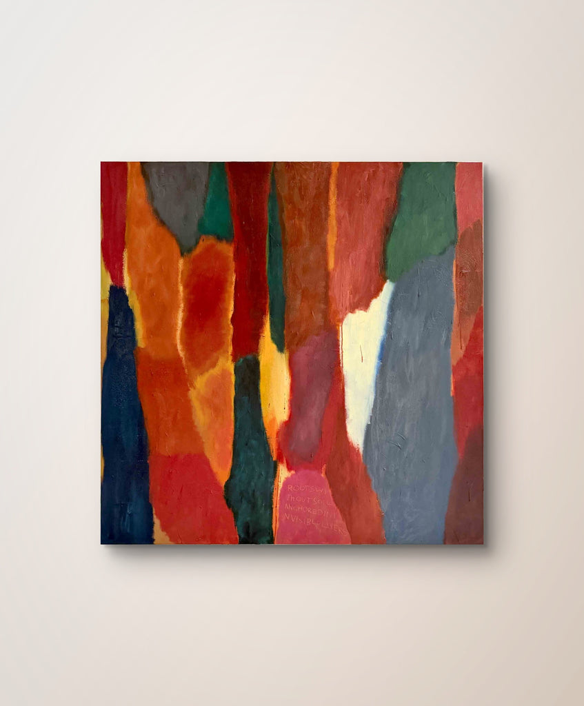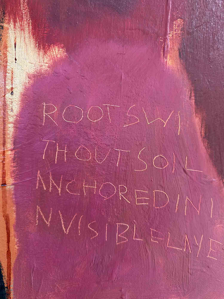 Cette toile porte en elle un palimpseste : sous les couches visibles se trouve un premier texte, "YOUR ELSEWHERE / OUR EXODUS”, gravé puis recouvert.